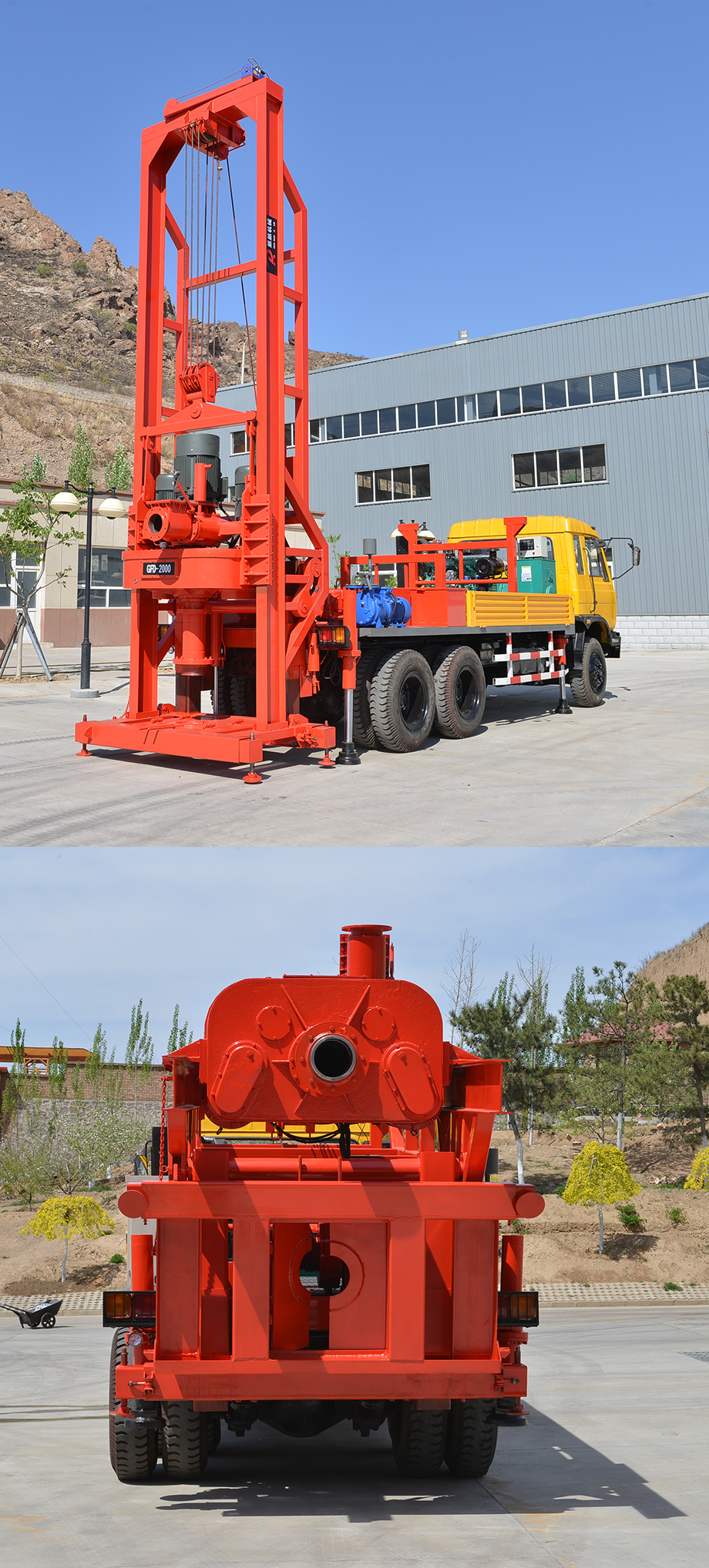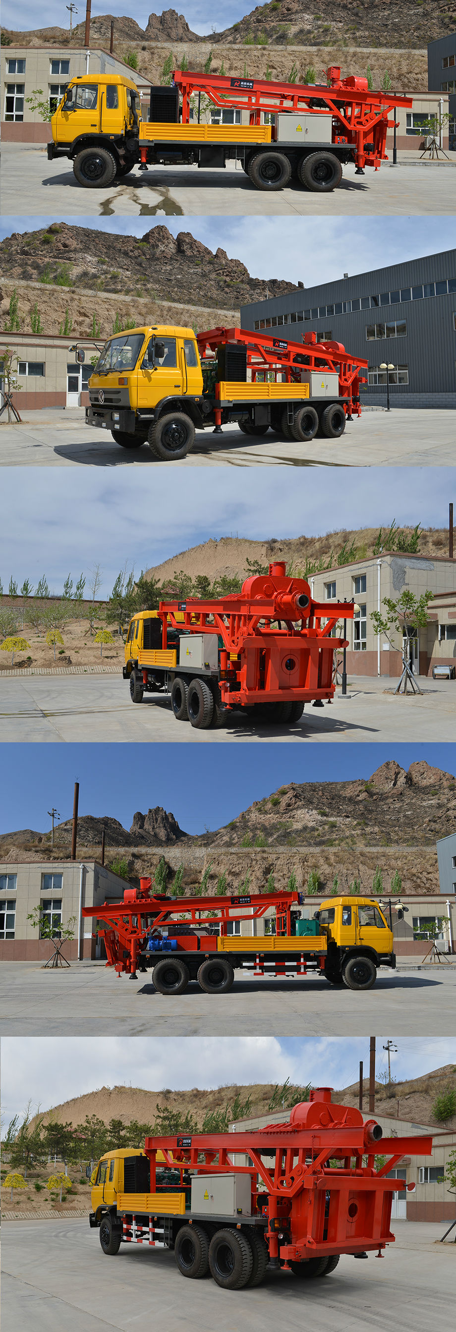 ●此機型是采用車(chē)載自走式,鉆機選用江鈴重汽6×4專(zhuān)用底盤(pán),軸距6.1米,玉柴發(fā)動(dòng)機。分動(dòng)箱、主傳動(dòng)系統、雙卷?yè)P機工組、泥漿泵、鉆塔等都安裝在汽車(chē)底盤(pán)上 。